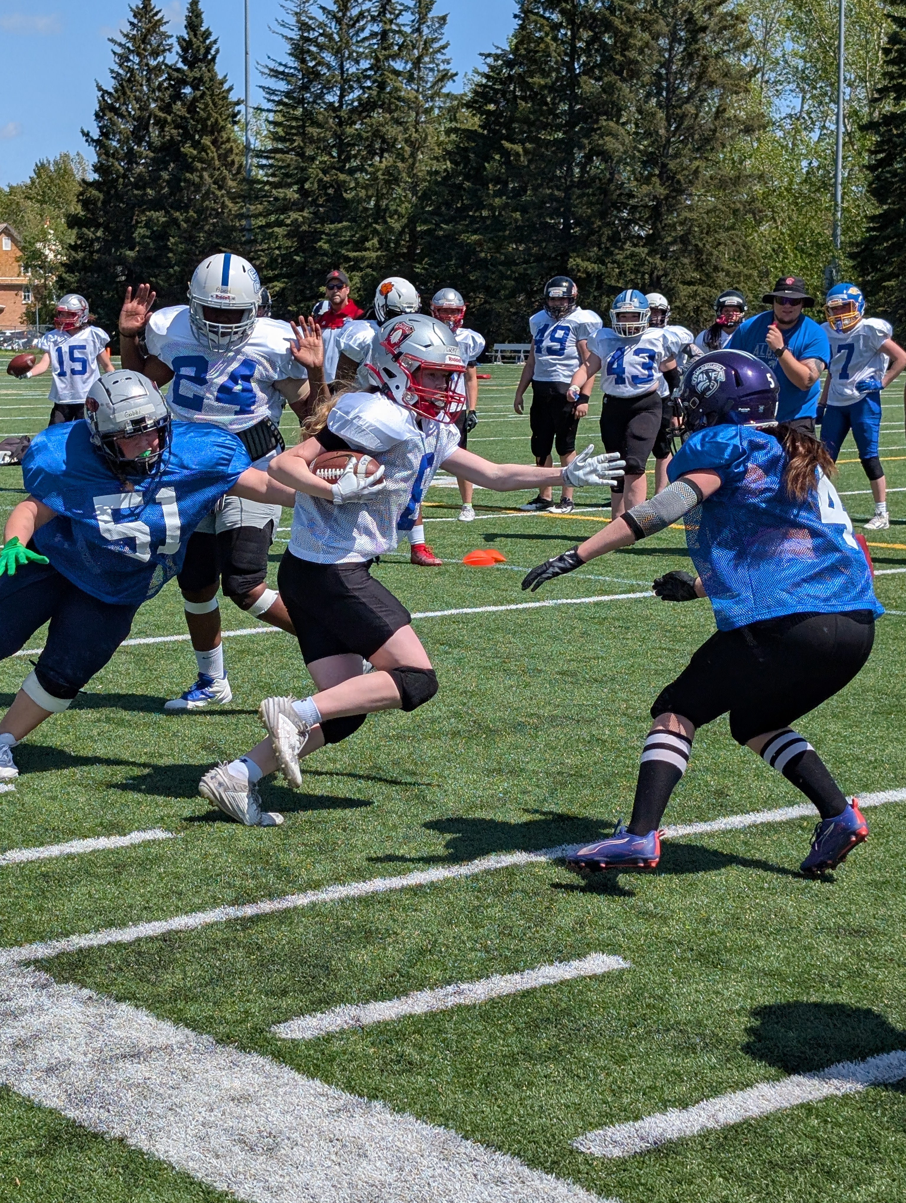 The first provincial U16 Female team was created in 2025. The final selected players went to Kelowna, BC for a game called "Battle of the Rockies." The U16 Female provincial team plays 6-a-side style tackle football.